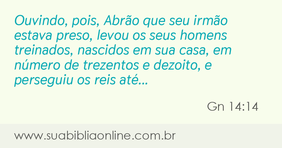 Faça sua busca na Bíblia. Sua Bíblia Online.Versão completa da Bíblia em Português com todos os livros, capítulos e versículos bíblicos.Ouvindo, pois, Abrão que o seu irmão estava preso, armou os seus criados, nascidos em sua casa, trezentos e dezoito, e os perseguiu até Dã.