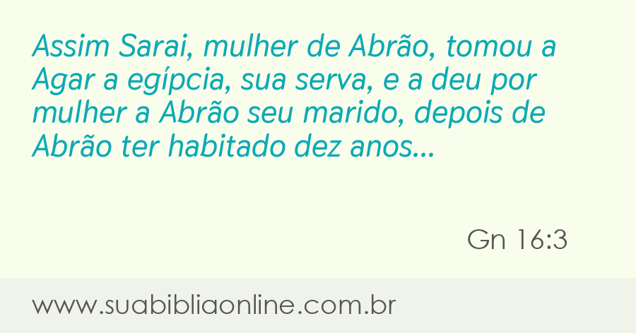 Faça sua busca na Bíblia. Sua Bíblia Online.Versão completa da Bíblia em Português com todos os livros, capítulos e versículos bíblicos.Assim tomou Sarai, mulher de Abrão, a Agar egípcia, sua serva, e deu-a por mulher a Abrão seu marido, ao fim de dez anos que Abrão habitara na terra de Canaã.