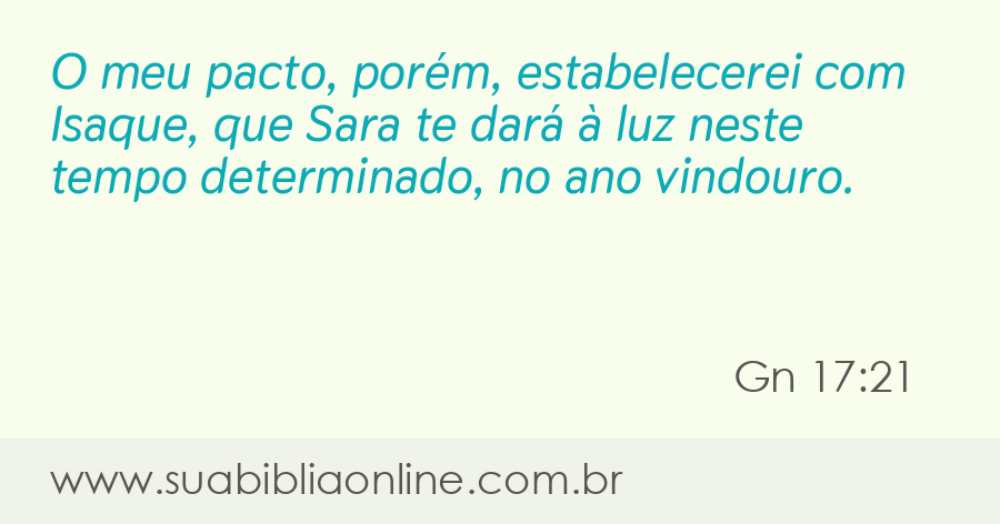 Faça sua busca na Bíblia. Sua Bíblia Online.Versão completa da Bíblia em Português com todos os livros, capítulos e versículos bíblicos.A minha aliança, porém, estabelecerei com Isaque, o qual Sara dará à luz neste tempo determinado, no ano seguinte.