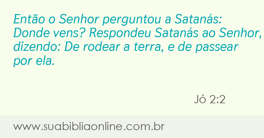 Faça sua busca na Bíblia. Sua Bíblia Online.Versão completa da Bíblia em Português com todos os livros, capítulos e versículos bíblicos.Então o SENHOR disse a Satanás: Donde vens? E respondeu Satanás ao SENHOR, e disse: De rodear a terra, e passear por ela.