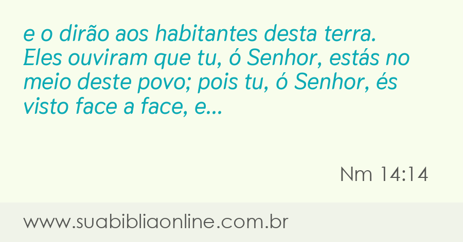 Faça sua busca na Bíblia. Sua Bíblia Online.Versão completa da Bíblia em Português com todos os livros, capítulos e versículos bíblicos.E dirão aos moradores desta terra, os quais ouviram que tu, ó SENHOR, estás no meio deste povo, que face a face, ó SENHOR, lhes apareces, que tua nuvem está sobre ele e que vais adiante dele numa coluna de nuvem de dia, e numa coluna de fogo de noite.