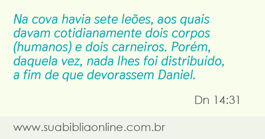 Na cova havia sete leões, aos quais davam cotidianamente dois corpos (humanos) e dois carneiros. Porém, daquela vez, nada lhes foi distribuído, a fim de que devorassem Daniel.