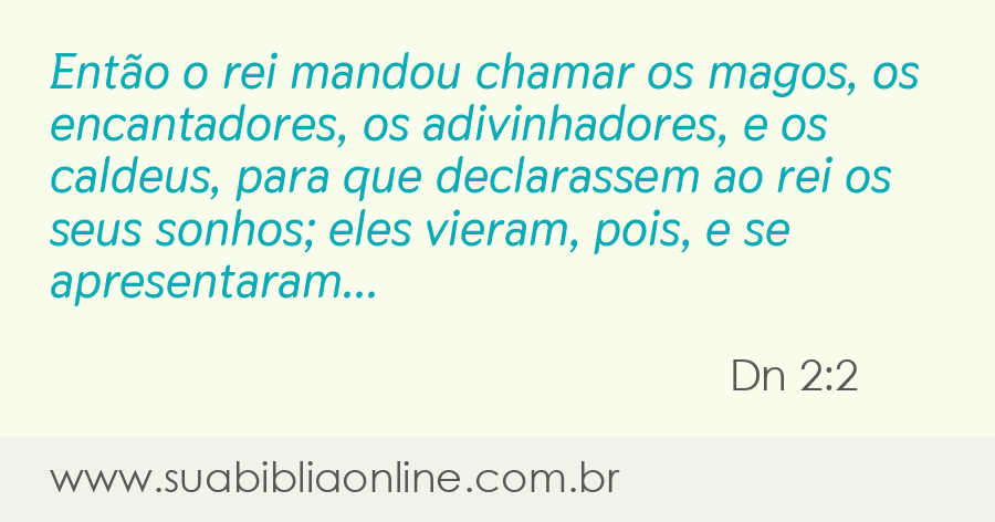 Faça sua busca na Bíblia. Sua Bíblia Online.Versão completa da Bíblia em Português com todos os livros, capítulos e versículos bíblicos.Então o rei mandou chamar os magos, os encantadores, os adivinhadores, e os caldeus, para que declarassem ao rei os seus sonhos; eles vieram, pois, e se apresentaram diante do rei.