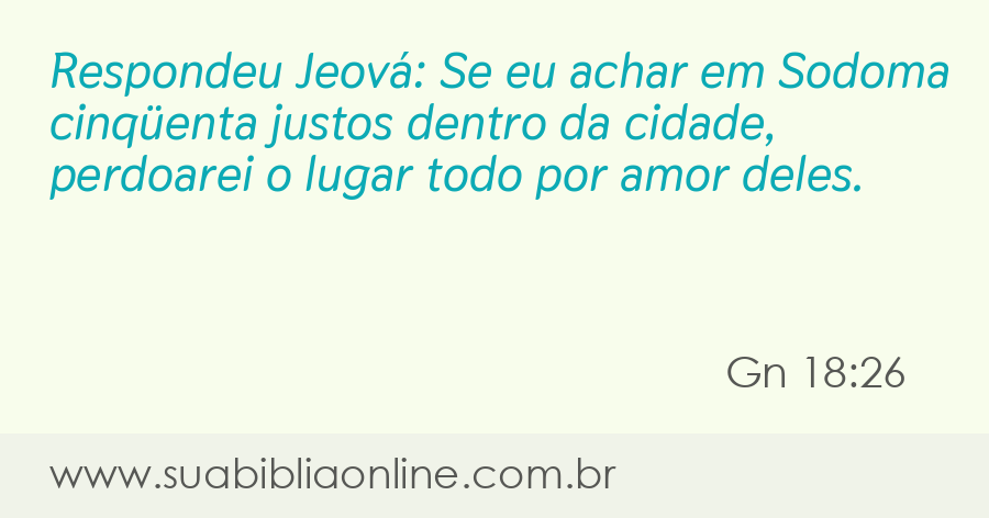 Faça sua busca na Bíblia. Sua Bíblia Online.Versão completa da Bíblia em Português com todos os livros, capítulos e versículos bíblicos.Então disse o Senhor: Se eu achar em Sodoma cinqüenta justos dentro da cidade, pouparei o lugar todo por causa deles.