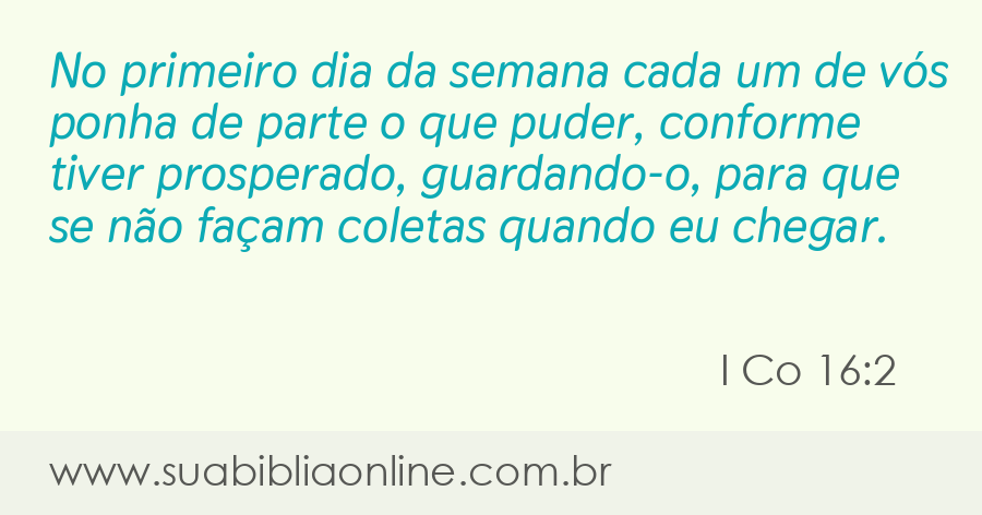 No primeiro dia da semana cada um de vós ponha de parte o que puder, conforme tiver prosperado, guardando-o, para que se não façam coletas quando eu chegar.