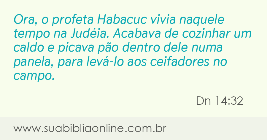 Ora, o profeta Habacuc vivia naquele tempo na Judéia. Acabava de cozinhar um caldo e picava pão dentro dele numa panela, para levá-lo aos ceifadores no campo.