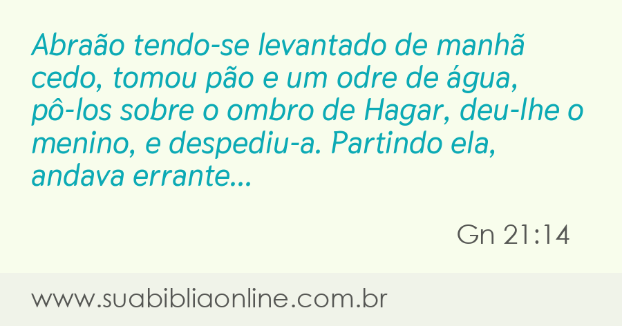 Faça sua busca na Bíblia. Sua Bíblia Online.Versão completa da Bíblia em Português com todos os livros, capítulos e versículos bíblicos.Então se levantou Abraão de manhã cedo e, tomando pão e um odre de àgua, os deu a Agar, pondo-os sobre o ombro dela; também lhe deu o menino e despediu-a; e ela partiu e foi andando errante pelo deserto de Beer-Seba.
