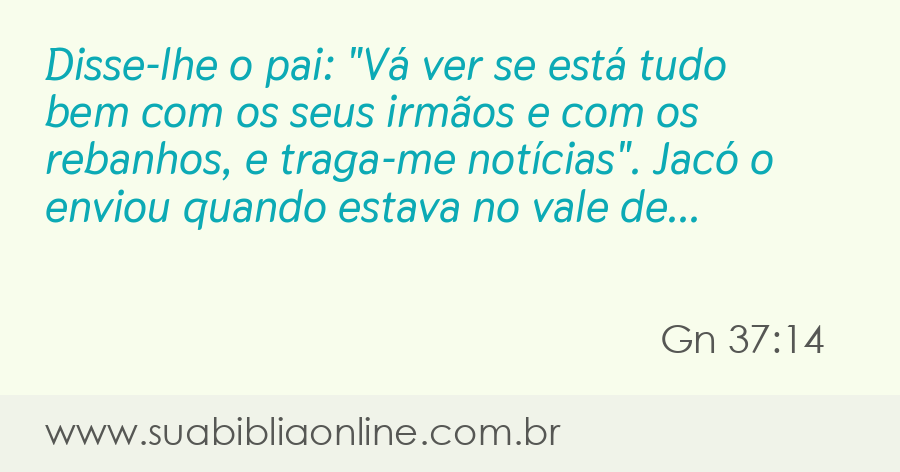 Faça sua busca na Bíblia. Sua Bíblia Online.Versão completa da Bíblia em Português com todos os livros, capítulos e versículos bíblicos.Disse-lhe Israel: Vai, vê se vão bem teus irmãos, e o rebanho; e traze-me resposta. Assim o enviou do vale de Hebrom; e José foi a Siquém.