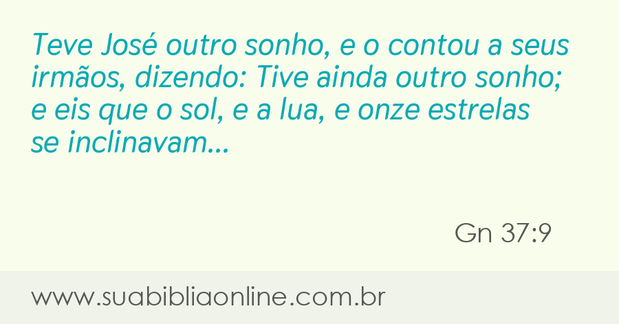 Faça sua busca na Bíblia. Sua Bíblia Online.Versão completa da Bíblia em Português com todos os livros, capítulos e versículos bíblicos.Teve José outro sonho, e o contou a seus irmãos, dizendo: Tive ainda outro sonho; e eis que o sol, e a lua, e onze estrelas se inclinavam perante mim.