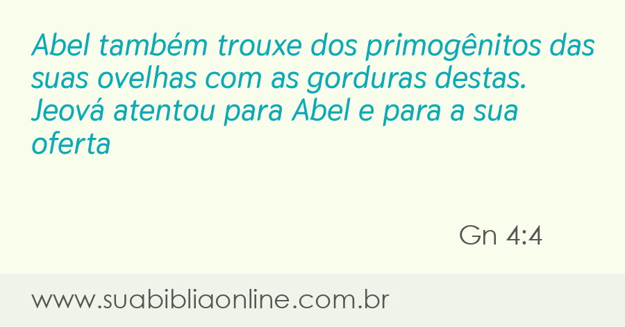 Faça sua busca na Bíblia. Sua Bíblia Online.Versão completa da Bíblia em Português com todos os livros, capítulos e versículos bíblicos.Abel também trouxe dos primogênitos das suas ovelhas, e da sua gordura. Ora, atentou o Senhor para Abel e para a sua oferta,
