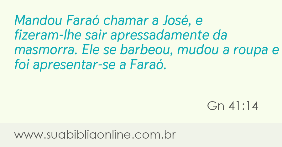 Faça sua busca na Bíblia. Sua Bíblia Online.Versão completa da Bíblia em Português com todos os livros, capítulos e versículos bíblicos.Então enviou Faraó, e chamou a José, e o fizeram sair logo da cova; e barbeou-se e mudou os seus vestidos, e veio a Faraó.