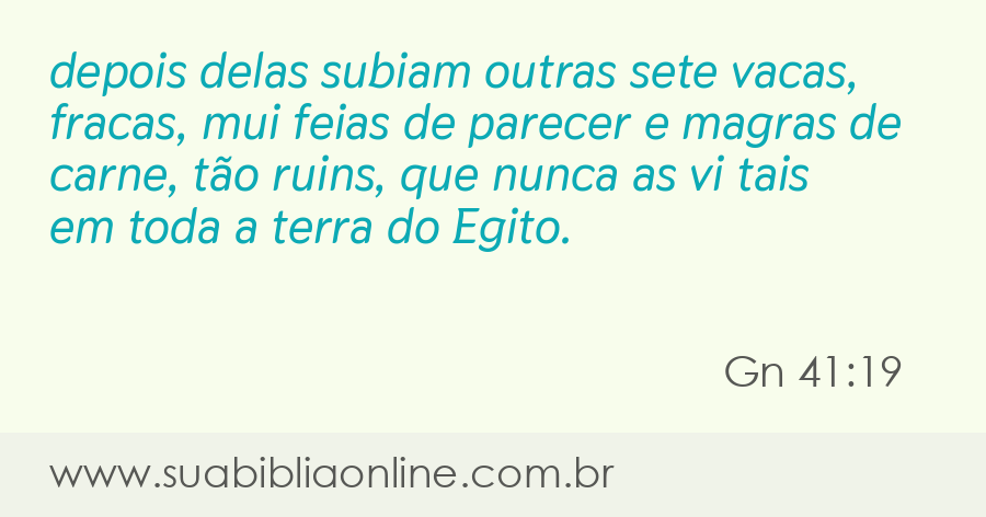 Faça sua busca na Bíblia. Sua Bíblia Online.Versão completa da Bíblia em Português com todos os livros, capítulos e versículos bíblicos.E eis que outras sete vacas subiam após estas, muito feias à vista, e magras de carne; não tenho visto outras taus, quanto à fealdade, em toda a terra do Egito