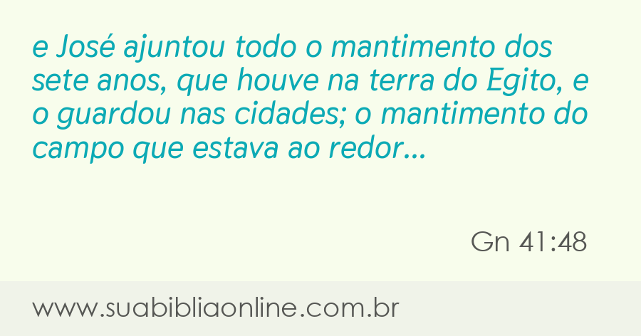 Faça sua busca na Bíblia. Sua Bíblia Online.Versão completa da Bíblia em Português com todos os livros, capítulos e versículos bíblicos.e José ajuntou todo o mantimento dos sete anos, que houve na terra do Egito, e o guardou nas cidades; o mantimento do campo que estava ao redor de cada cidade, guardou-o dentro da mesma.