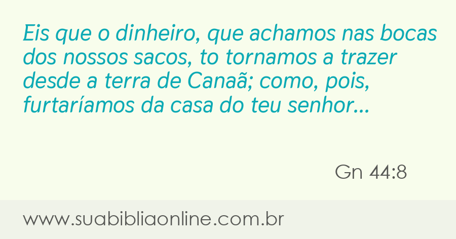 Faça sua busca na Bíblia. Sua Bíblia Online.Versão completa da Bíblia em Português com todos os livros, capítulos e versículos bíblicos.Eis que o dinheiro, que achamos nas bocas dos nossos sacos, to tornamos a trazer desde a terra de Canaã; como, pois, furtaríamos da casa do teu senhor prata ou ouro?