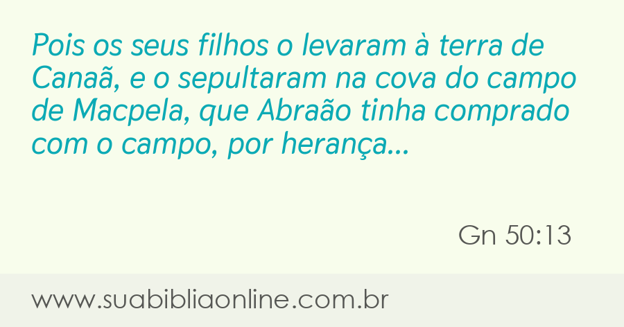 Faça sua busca na Bíblia. Sua Bíblia Online.Versão completa da Bíblia em Português com todos os livros, capítulos e versículos bíblicos.pois o levaram para a terra de Canaã, e o sepultaram na cova do campo de Macpela, que Abraão tinha comprado com o campo, como propriedade de sepultura, a Efrom, o heteu, em frente de Manre.