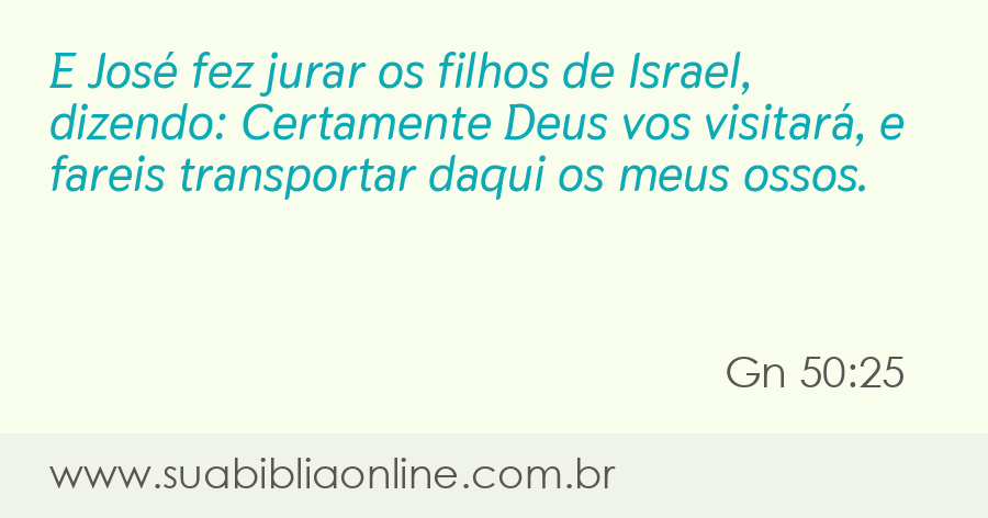Faça sua busca na Bíblia. Sua Bíblia Online.Versão completa da Bíblia em Português com todos os livros, capítulos e versículos bíblicos.E José fez jurar os filhos de Israel, dizendo: Certamente Deus vos visitará, e fareis transportar daqui os meus ossos.