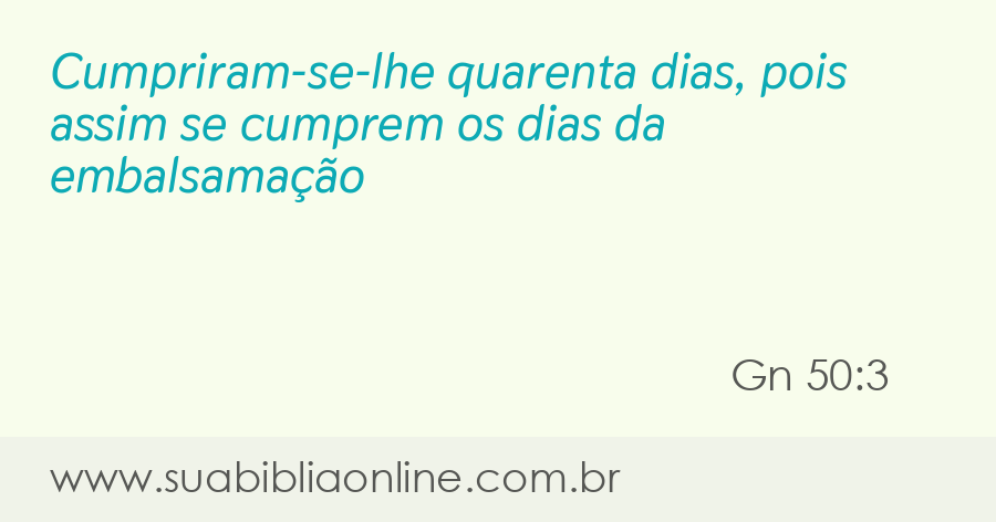Faça sua busca na Bíblia. Sua Bíblia Online.Versão completa da Bíblia em Português com todos os livros, capítulos e versículos bíblicos.Cumpriram-se-lhe quarenta dias, porque assim se cumprem os dias de embalsamação; e os egípcios o choraram setenta dias.