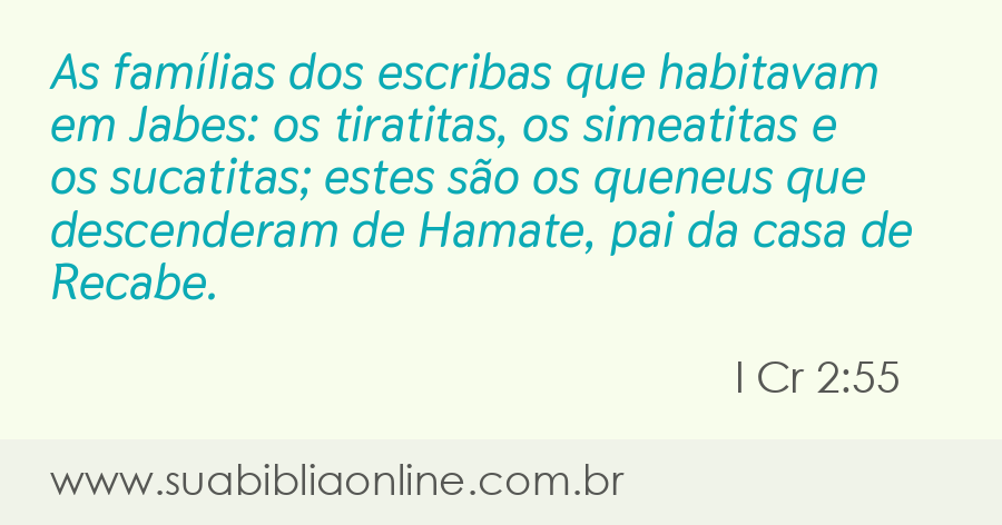 As famílias dos escribas que habitavam em Jabes: os tiratitas, os simeatitas e os sucatitas; estes são os queneus que descenderam de Hamate, pai da casa de Recabe.