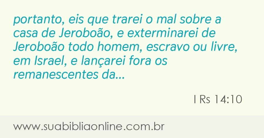 portanto, eis que trarei o mal sobre a casa de Jeroboão, e exterminarei de Jeroboão todo homem, escravo ou livre, em Israel, e lançarei fora os remanescentes da casa de Jeroboão, como se lança fora o esterco, até que de todo se acabe.