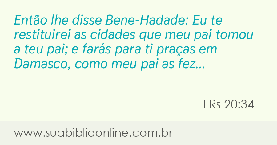 Então lhe disse Bene-Hadade: Eu te restituirei as cidades que meu pai tomou a teu pai; e farás para ti praças em Damasco, como meu pai as fez em Samária. E eu, respondeu Acabe, com esta aliança te deixarei ir. E fez com ele aliança e o deixou ir.