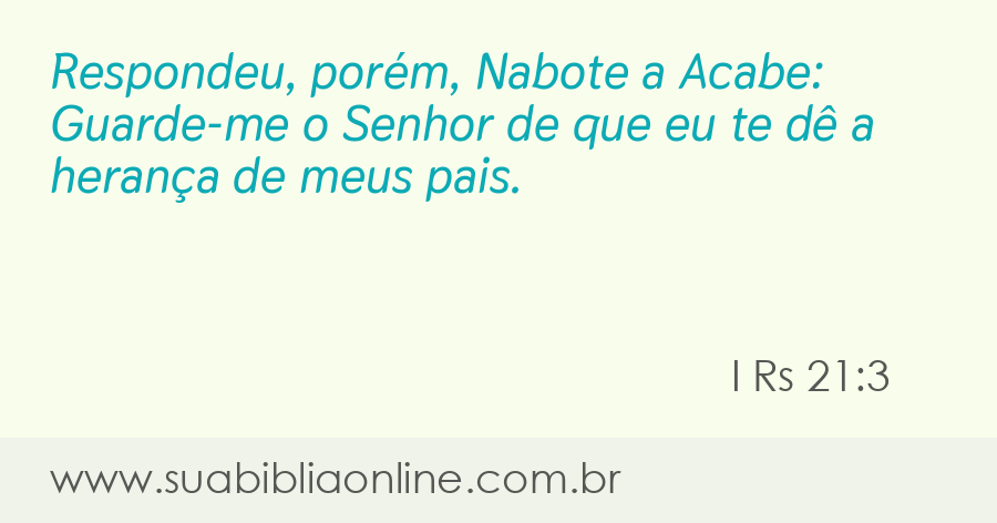 Respondeu, porém, Nabote a Acabe: Guarde-me o Senhor de que eu te dê a herança de meus pais.