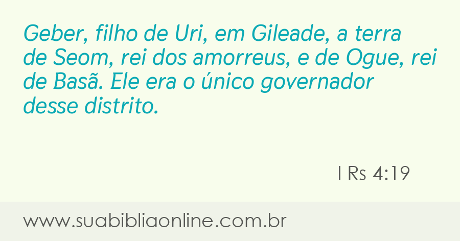 Geber, filho de Uri, na terra de Gileade, a terra de Siom, rei dos amorreus, e de Ogue, rei de Basã; havia um só intendente naquela terra.