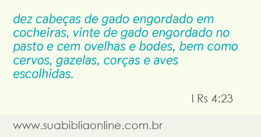 dez bois cevados, vinte bois de pasto e cem ovelhas, afora os veados, gazelas, cabras montesas e aves cevadas.