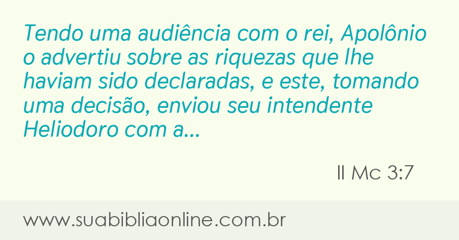 Tendo uma audiência com o rei, Apolônio o advertiu sobre as riquezas que lhe haviam sido declaradas, e este, tomando uma decisão, enviou seu intendente Heliodoro com a ordem de trazer as ditas riquezas.