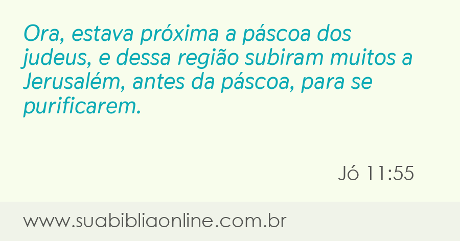 Faça sua busca na Bíblia. Sua Bíblia Online.Versão completa da Bíblia em Português com todos os livros, capítulos e versículos bíblicos.Ora, estava próxima a páscoa dos judeus, e dessa região subiram muitos a Jerusalém, antes da páscoa, para se purificarem.