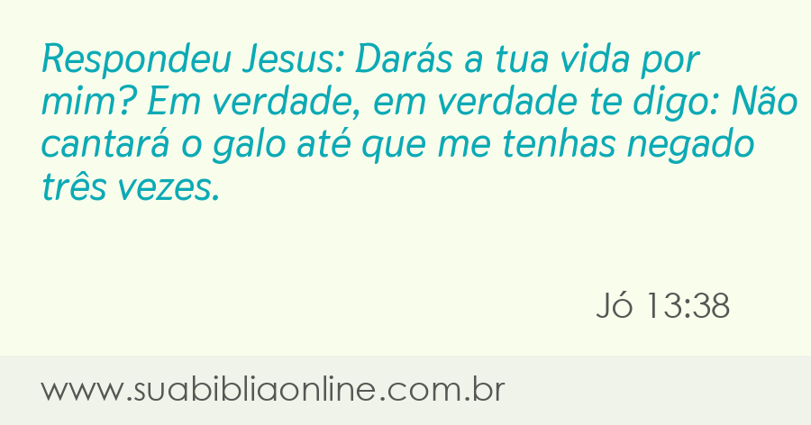 Faça sua busca na Bíblia. Sua Bíblia Online.Versão completa da Bíblia em Português com todos os livros, capítulos e versículos bíblicos.Respondeu Jesus: Darás a tua vida por mim? Em verdade, em verdade te digo: Não cantará o galo até que me tenhas negado três vezes.