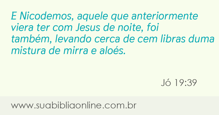 Faça sua busca na Bíblia. Sua Bíblia Online.Versão completa da Bíblia em Português com todos os livros, capítulos e versículos bíblicos.E Nicodemos, aquele que anteriormente viera ter com Jesus de noite, foi também, levando cerca de cem libras duma mistura de mirra e aloés.
