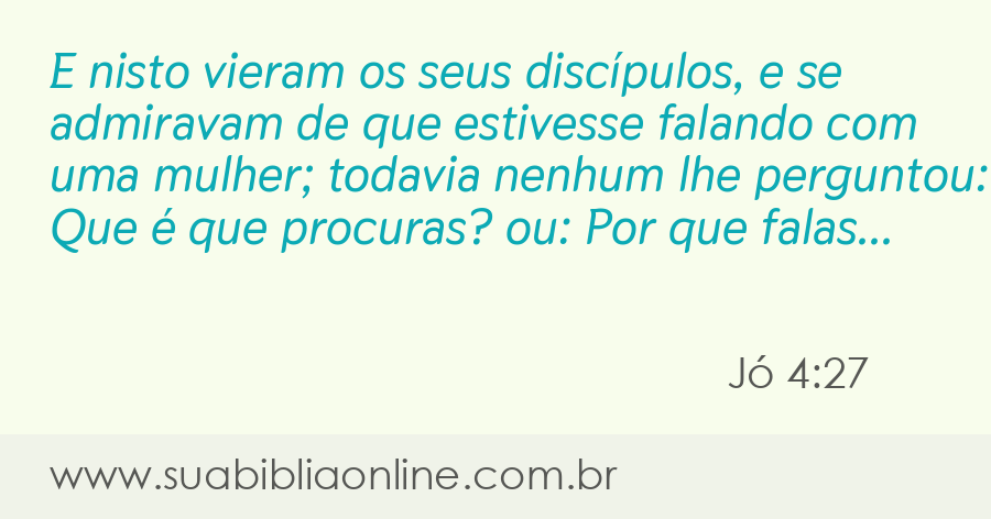 Faça sua busca na Bíblia. Sua Bíblia Online.Versão completa da Bíblia em Português com todos os livros, capítulos e versículos bíblicos.E nisto vieram os seus discípulos, e se admiravam de que estivesse falando com uma mulher; todavia nenhum lhe perguntou: Que é que procuras? ou: Por que falas com ela?