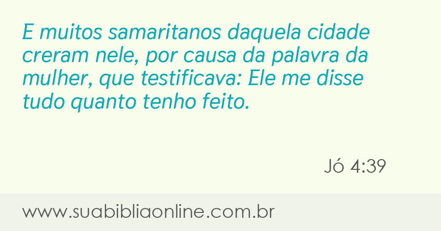 Faça sua busca na Bíblia. Sua Bíblia Online.Versão completa da Bíblia em Português com todos os livros, capítulos e versículos bíblicos.E muitos samaritanos daquela cidade creram nele, por causa da palavra da mulher, que testificava: Ele me disse tudo quanto tenho feito.