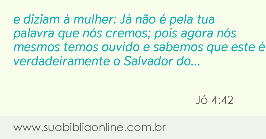 Faça sua busca na Bíblia. Sua Bíblia Online.Versão completa da Bíblia em Português com todos os livros, capítulos e versículos bíblicos.e diziam à mulher: Já não é pela tua palavra que nós cremos; pois agora nós mesmos temos ouvido e sabemos que este é verdadeiramente o Salvador do mundo.