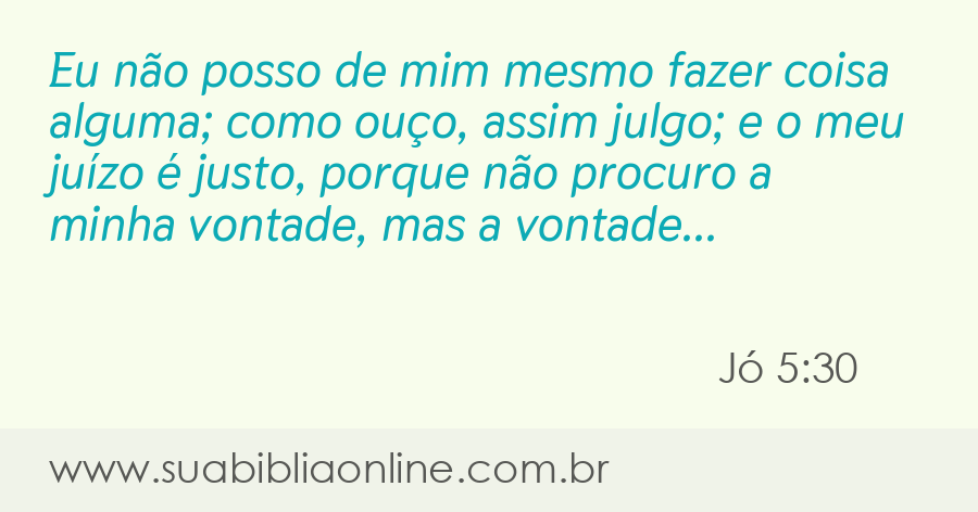 Faça sua busca na Bíblia. Sua Bíblia Online.Versão completa da Bíblia em Português com todos os livros, capítulos e versículos bíblicos.Eu não posso de mim mesmo fazer coisa alguma; como ouço, assim julgo; e o meu juízo é justo, porque não procuro a minha vontade, mas a vontade daquele que me enviou.