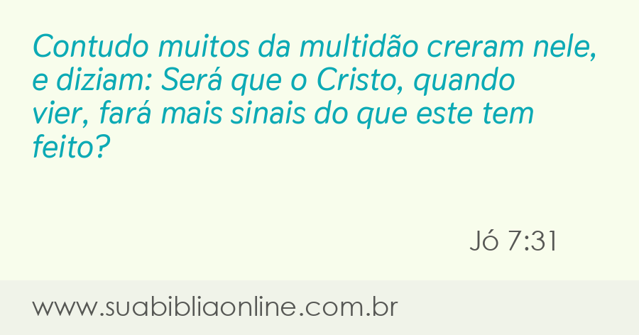 Faça sua busca na Bíblia. Sua Bíblia Online.Versão completa da Bíblia em Português com todos os livros, capítulos e versículos bíblicos.Contudo muitos da multidão creram nele, e diziam: Será que o Cristo, quando vier, fará mais sinais do que este tem feito?