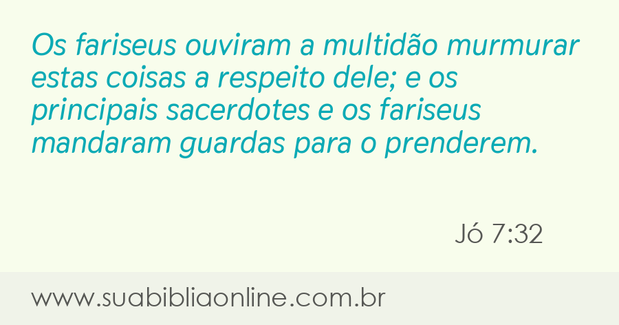 Faça sua busca na Bíblia. Sua Bíblia Online.Versão completa da Bíblia em Português com todos os livros, capítulos e versículos bíblicos.Os fariseus ouviram a multidão murmurar estas coisas a respeito dele; e os principais sacerdotes e os fariseus mandaram guardas para o prenderem.