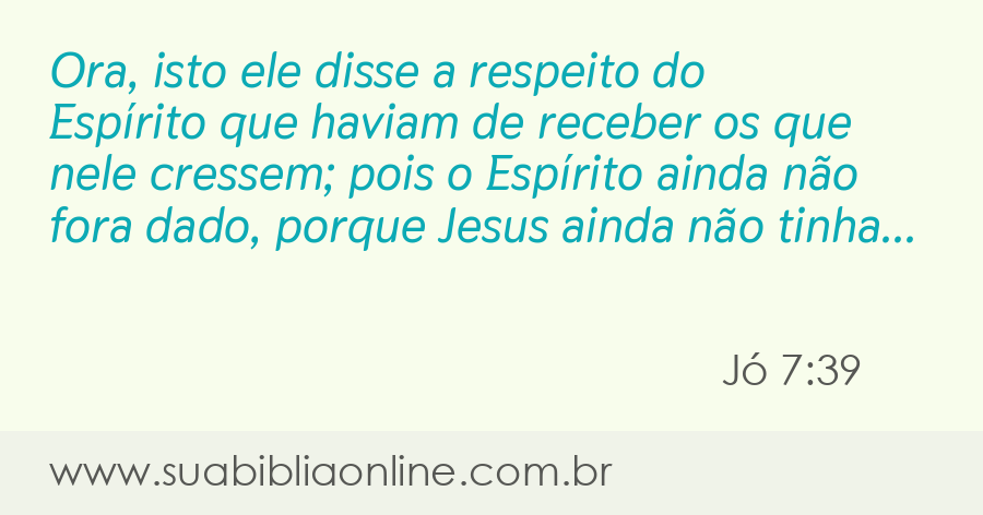 Faça sua busca na Bíblia. Sua Bíblia Online.Versão completa da Bíblia em Português com todos os livros, capítulos e versículos bíblicos.Ora, isto ele disse a respeito do Espírito que haviam de receber os que nele cressem; pois o Espírito ainda não fora dado, porque Jesus ainda não tinha sido glorificado.