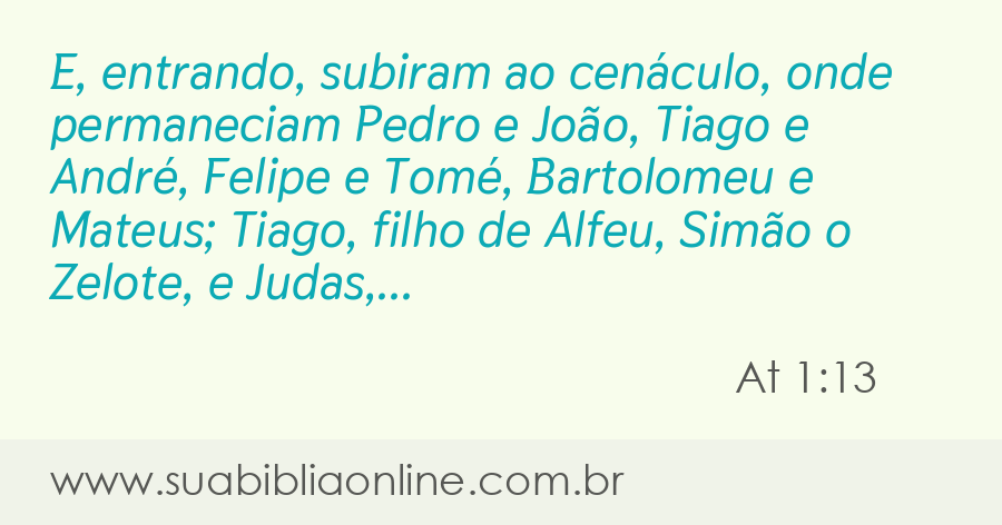 Faça sua busca na Bíblia. Sua Bíblia Online.Versão completa da Bíblia em Português com todos os livros, capítulos e versículos bíblicos.E, entrando, subiram ao cenáculo, onde permaneciam Pedro e João, Tiago e André, Felipe e Tomé, Bartolomeu e Mateus; Tiago, filho de Alfeu, Simão o Zelote, e Judas, filho de Tiago.
