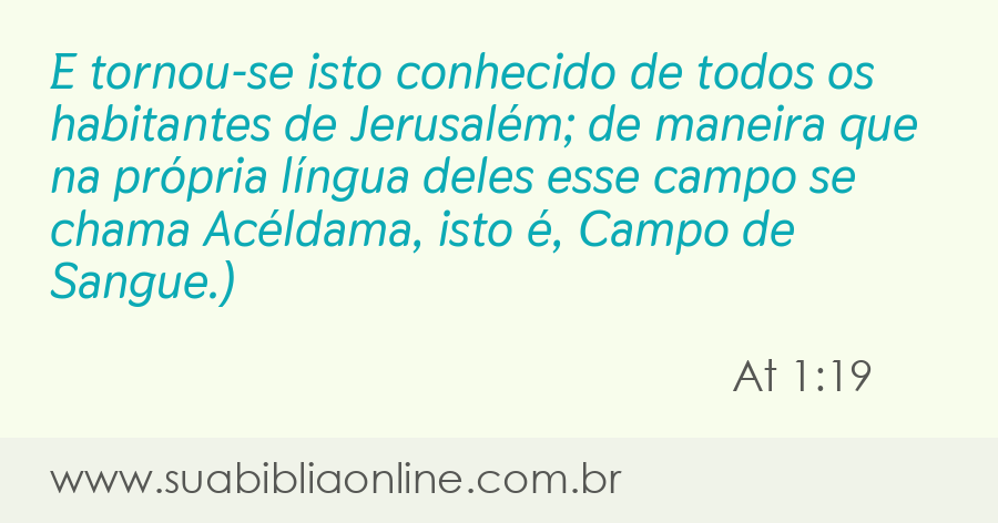 Faça sua busca na Bíblia. Sua Bíblia Online.Versão completa da Bíblia em Português com todos os livros, capítulos e versículos bíblicos.E tornou-se isto conhecido de todos os habitantes de Jerusalém; de maneira que na própria língua deles esse campo se chama Acéldama, isto é, Campo de Sangue.)