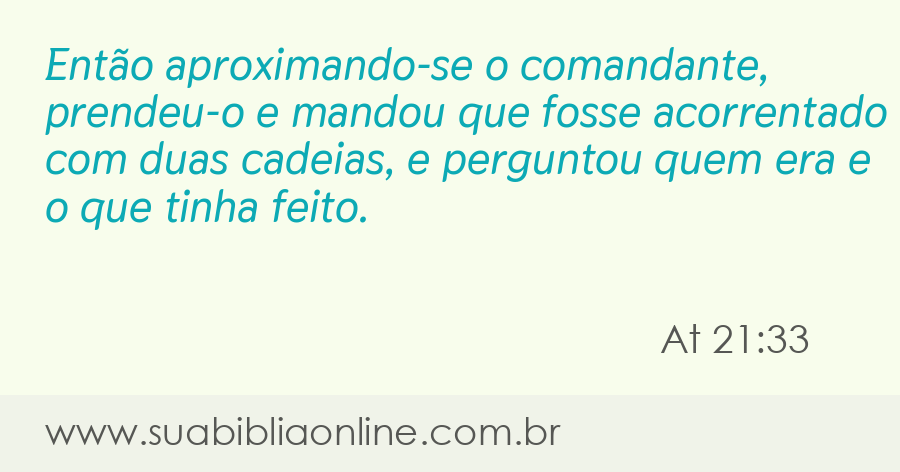 Então aproximando-se o comandante, prendeu-o e mandou que fosse acorrentado com duas cadeias, e perguntou quem era e o que tinha feito.