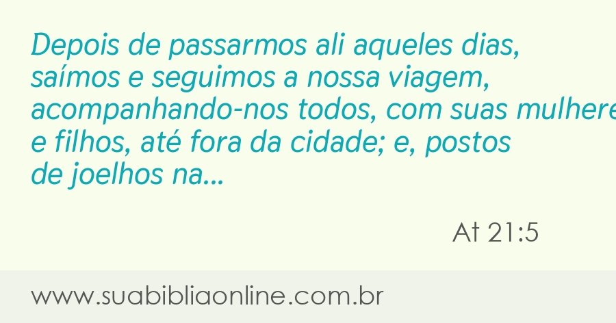 Depois de passarmos ali aqueles dias, saímos e seguimos a nossa viagem, acompanhando-nos todos, com suas mulheres e filhos, até fora da cidade; e, postos de joelhos na praia, oramos,