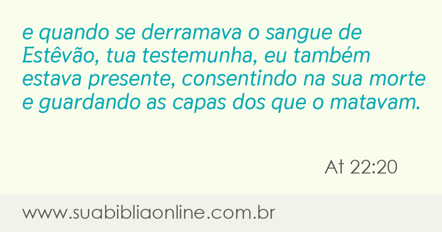 e quando se derramava o sangue de Estêvão, tua testemunha, eu também estava presente, consentindo na sua morte e guardando as capas dos que o matavam.