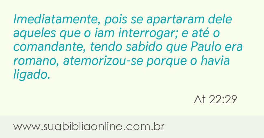 Imediatamente, pois se apartaram dele aqueles que o iam interrogar; e até o comandante, tendo sabido que Paulo era romano, atemorizou-se porque o havia ligado.