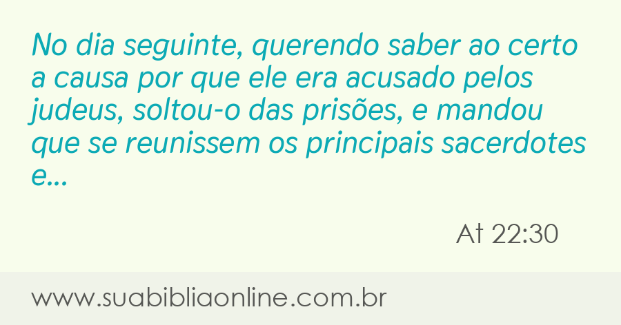 No dia seguinte, querendo saber ao certo a causa por que ele era acusado pelos judeus, soltou-o das prisões, e mandou que se reunissem os principais sacerdotes e todo o sinédrio; e, trazendo Paulo, apresentou-o diante deles.