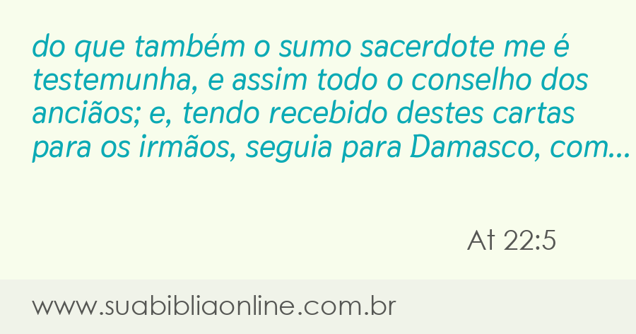 do que também o sumo sacerdote me é testemunha, e assim todo o conselho dos anciãos; e, tendo recebido destes cartas para os irmãos, seguia para Damasco, com o fim de trazer algemados a Jerusalém aqueles que ali estivessem, para que fossem castigados.