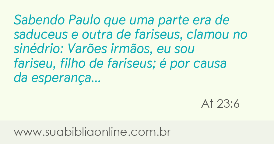 Sabendo Paulo que uma parte era de saduceus e outra de fariseus, clamou no sinédrio: Varões irmãos, eu sou fariseu, filho de fariseus; é por causa da esperança da ressurreição dos mortos que estou sendo julgado.