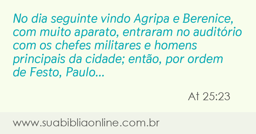 No dia seguinte vindo Agripa e Berenice, com muito aparato, entraram no auditório com os chefes militares e homens principais da cidade; então, por ordem de Festo, Paulo foi trazido.