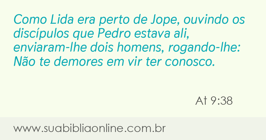 Como Lida era perto de Jope, ouvindo os discípulos que Pedro estava ali, enviaram-lhe dois homens, rogando-lhe: Não te demores em vir ter conosco.