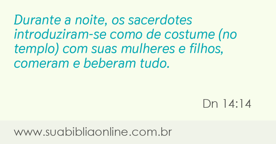 Faça sua busca na Bíblia. Sua Bíblia Online.Versão completa da Bíblia em Português com todos os livros, capítulos e versículos bíblicos.Durante a noite, os sacerdotes introduziram-se como de costume (no templo) com suas mulheres e filhos, comeram e beberam tudo.